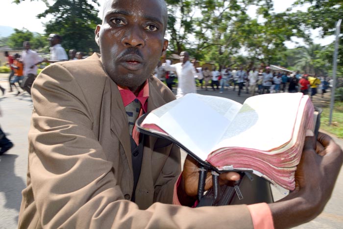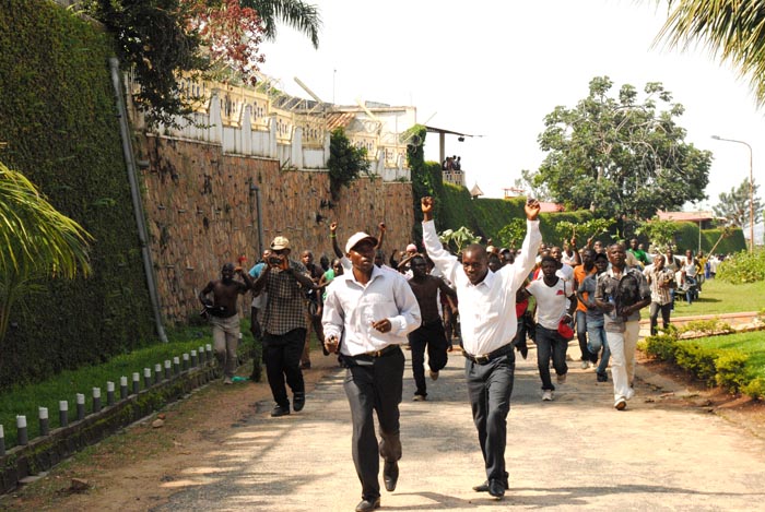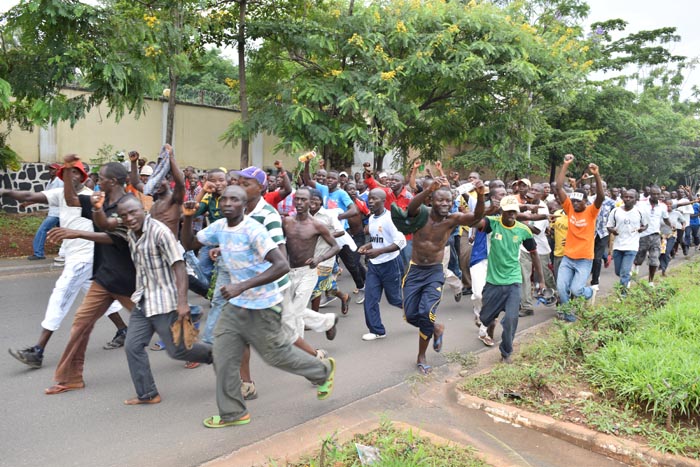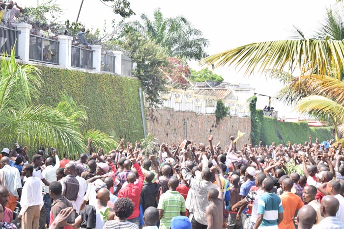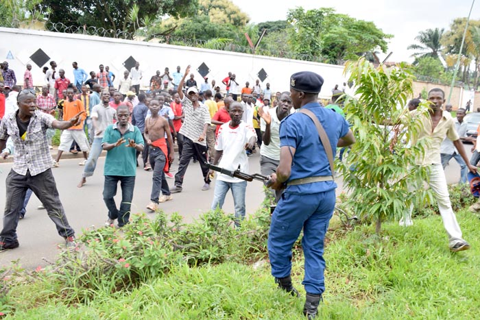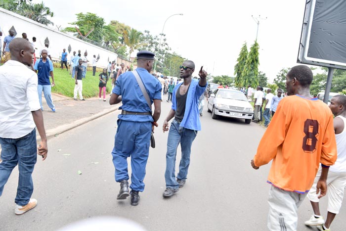 Lundi, 15 décembre 2014 – Le véhicule transportant Agathon Rwasa au milieu de ses sympathisants ©R.N /Iwacu Lundi, 15 décembre 2014 – Pendant la manifestation, certains sympathisans ont été arrêtés ©R.N /Iwacu Lundi, 15 décembre 2014 – Pour exprimer leur soutien, certains sont venus avec des affiches pour réclamer que justice soit faite pour tous ©R.N /Iwacu Lundi, 15 décembre 2014 – Au boulevard du 28 novembre au retour des sympathisants à M. Rwasa à leur domicile. La police s’est interposée pour empêcher que la manifestation ne dégénère ©R.N /Iwacu Lundi, 15 décembre 2014 – Ce militant brandit les écritures saintes comme témoin ©R.N /Iwacu Lundi, 15 décembre 2014 – Ce militant brandit les écritures saintes comme témoin ©R.N /Iwacu Lundi, 15 décembre 2014 – Des sympathisans se rendant au domicile de M. Rwasa ©R.N /Iwacu Lundi, 15 décembre 2014 – Devant le domicile de M. Rwasa, la foule attendait son discours d’apaisement ©R.N /Iwacu Lundi, 15 décembre 2014 – Agathon Rwasa : « Le ministère public et les juridictions ordinaires sont incompétents à statuer sur le cas des politiques bénéficiant d’une immunité provisoire. » ©R.N /Iwacu Lundi, 15 décembre 2014 – Acharnement entre ce policier et les sympathisans de M. Rwasa au boulevard du 28 novembre ©R.N /Iwacu Lundi, 15 décembre 2014 – Entonnant des chansons, ces manifestants prennent la route vers Kiriri, au domicile de M. Rwasa ©R.N /Iwacu Lundi, 15 décembre 2014 – Il a fallu qu’Agathon Rwasa prononce un discours d’apaisement pour que ses sympathisans venus le soutenir rentrent ©R.N /Iwacu