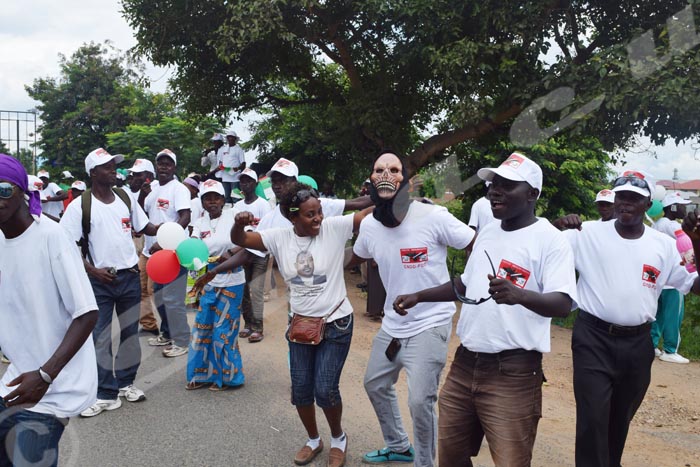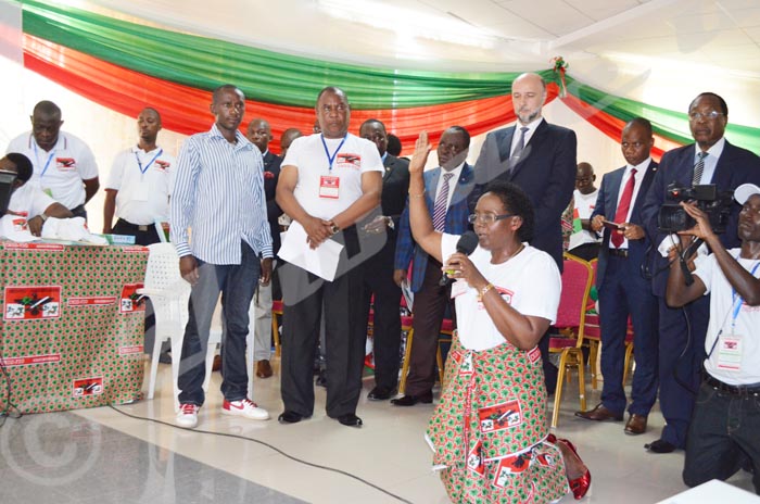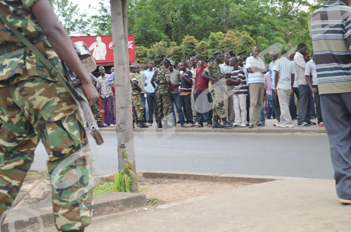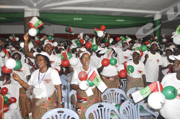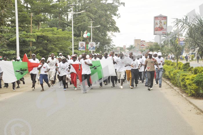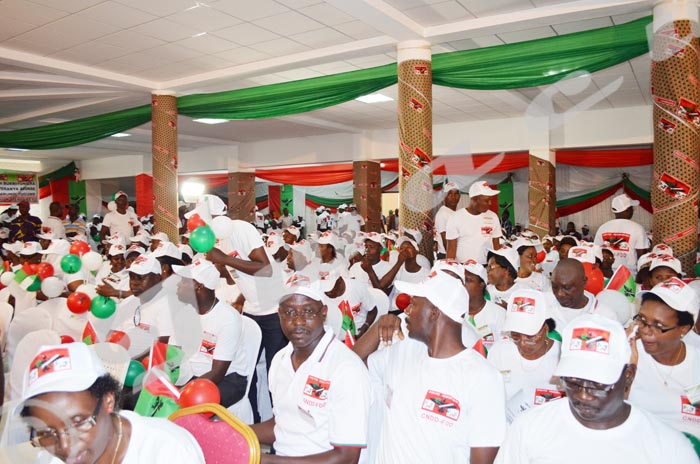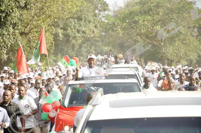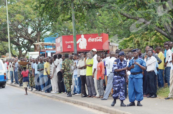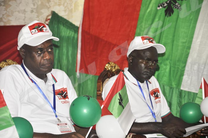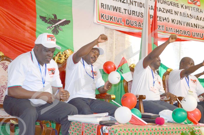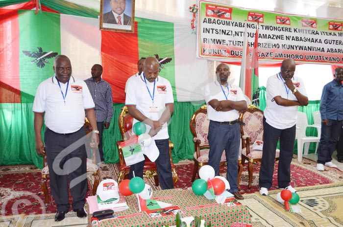 Pierre Nkurunziza manifeste sa joie Le candidat Nkurunziza : « Maintenant je suis votre candidat à 700% » ©Iwacu En plus des mots déplacés, pas de commentaire sur le masque de cet imbonerakure ©F.N/Iwacu Des militaires et des policiers sont tous yeux au campus universitaires de Mutanga ©A.U/Iwacu A la gare du Nord, les bus de transport étaient débordés par un grand nombre de personnes qui voulaient aller à l’intérieur ©R.N/Iwacu Pierre Nkurunziza au milieu des ténors du parti ©D.N/Iwacu Habemus Peter ! Apparemment Pie Ntavyohanyuma (président de l’Assemblée Nationale) et Isidore Rufyikiri (2ème vice-président de la République) n’étaient pas contents Elle prie pour l’activité ©C.B/Iwacu Pendant la prière, au début du congrès ©C.B/Iwacu Rassemblement à l’EST Kamenge ©C.B/Iwacu Ces jeunes terrorisent en chant: « Kubita abakeba mbonerakure, inkona ntiyaruzwa kirazira »/Tabassez les adversaires, mbonerakure, jamais on ne peut déloger l’aigle. Ils courent sur différentes rues de Bujumbura ©D.N/Iwacu Des militaires lourdement armés font face à des étudiants massés devant l’entrée du campus Mutanga. Une mesure de sécurité inédite ©A.U/Iwacu