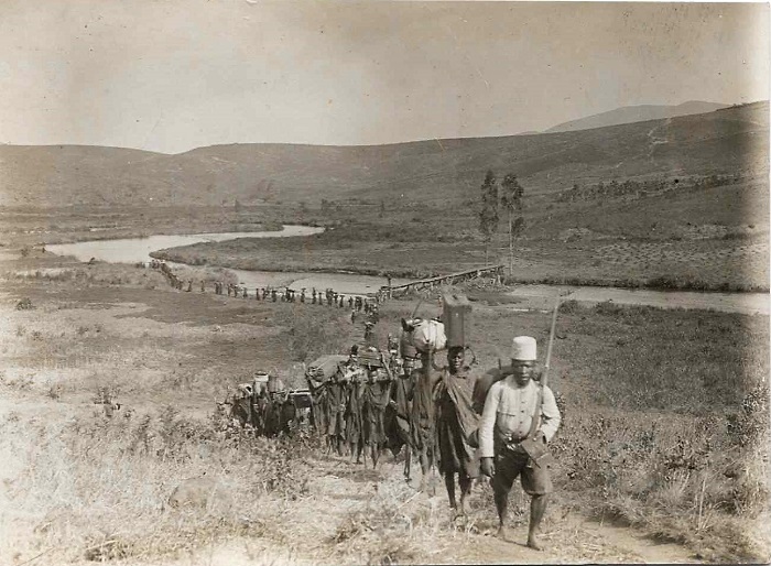 Campagne de l'Est-africain en Urundi, la Ruvyironza, colonne avec porteurs, pont de fortune